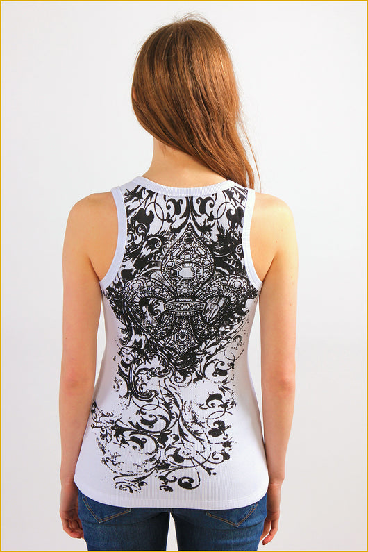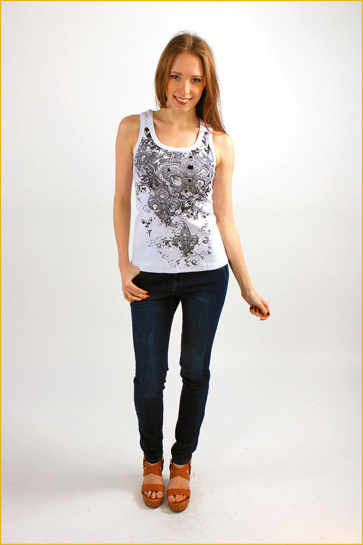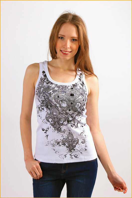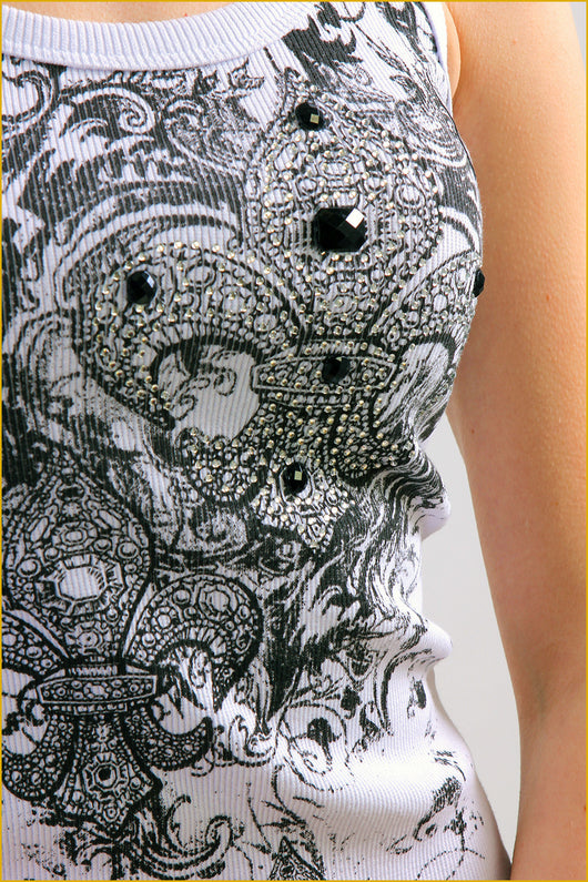 This top is beautifully finished with a embellished front detail. Dress down with jeans and a cardigan for a casual weekend look. The details: scoop neck, jewelled front, front and back printed, ribbed trim with a bodycon fit. Composition: 95% Viscose, 5% Elastane