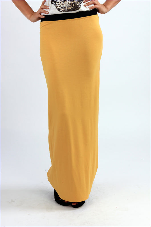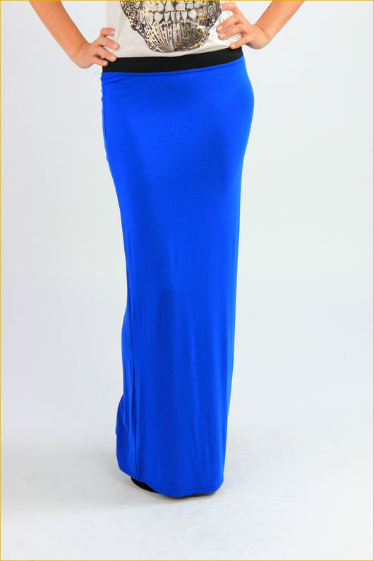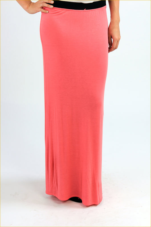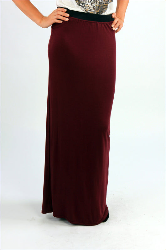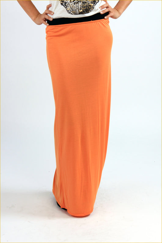 A maxi skirt crafted in jersey material, a high contrasting elastic waistband, a slim line and straight maxi cut.