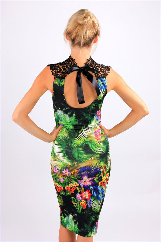 Get the perfect trendy look, this dress is the perfect piece to create a confident and co-ordinate look. The details: Made from stretch poly fabric, Tropical print throughout, lace insert with a bodycon fit.Composition: 95% Polyester, 5% Elastane.