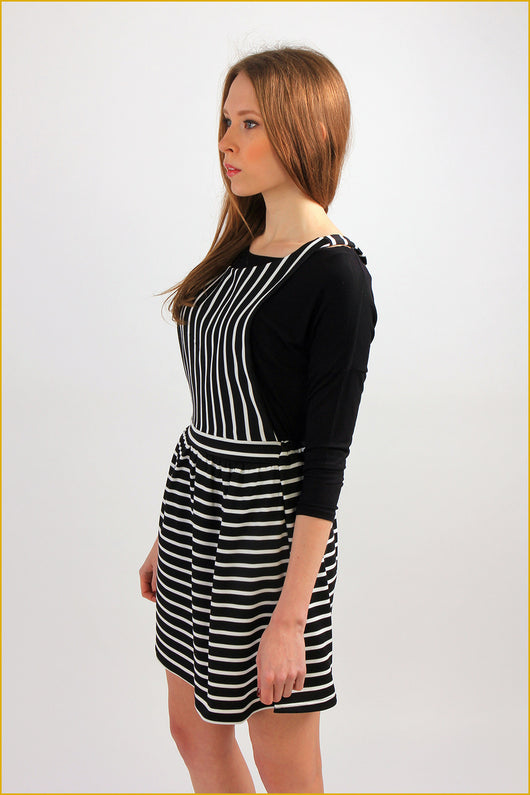 Get the latest look with this twin set featuring an eye-catching pinafore dress and striking style. The details include: A plain t-shirt and pinafore dress with monochrome stripe and cross over reverse straps. Composition: 95% Polyester, 5% Elastane