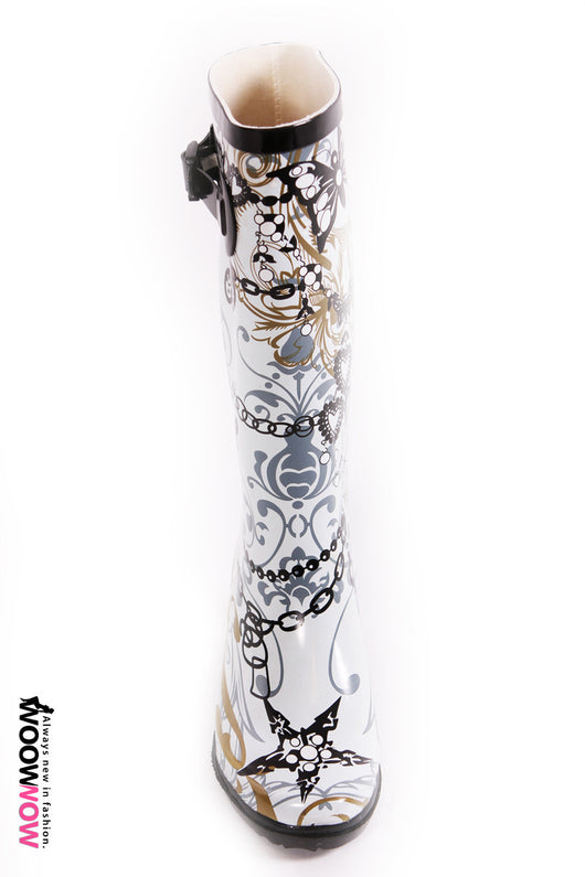A pair of Wellington boots featuring a wedge rubber heel, knee high length, buckle strap to the side, a pretty butterfly print, and a rubber material.