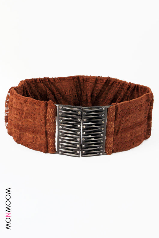 A waist belt featuring a wide cut, crafted in a lace look material with a silver detail front.